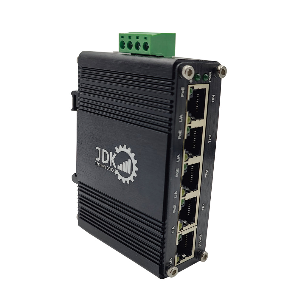 The JDK-POE-4P12 Series features an industry-standard IP40 dustproof and sealed design, housed in a rugged high-strength metal case for maximum durability. Engineered to operate flawlessly in extreme temperature ranges from -40°C to 80°C (-40°F to 176°F), this industrial PoE switch is perfect for harsh environments, ensuring long-lasting and reliable performance in demanding industrial applications. Support DIN-Rail & Wall Mount.